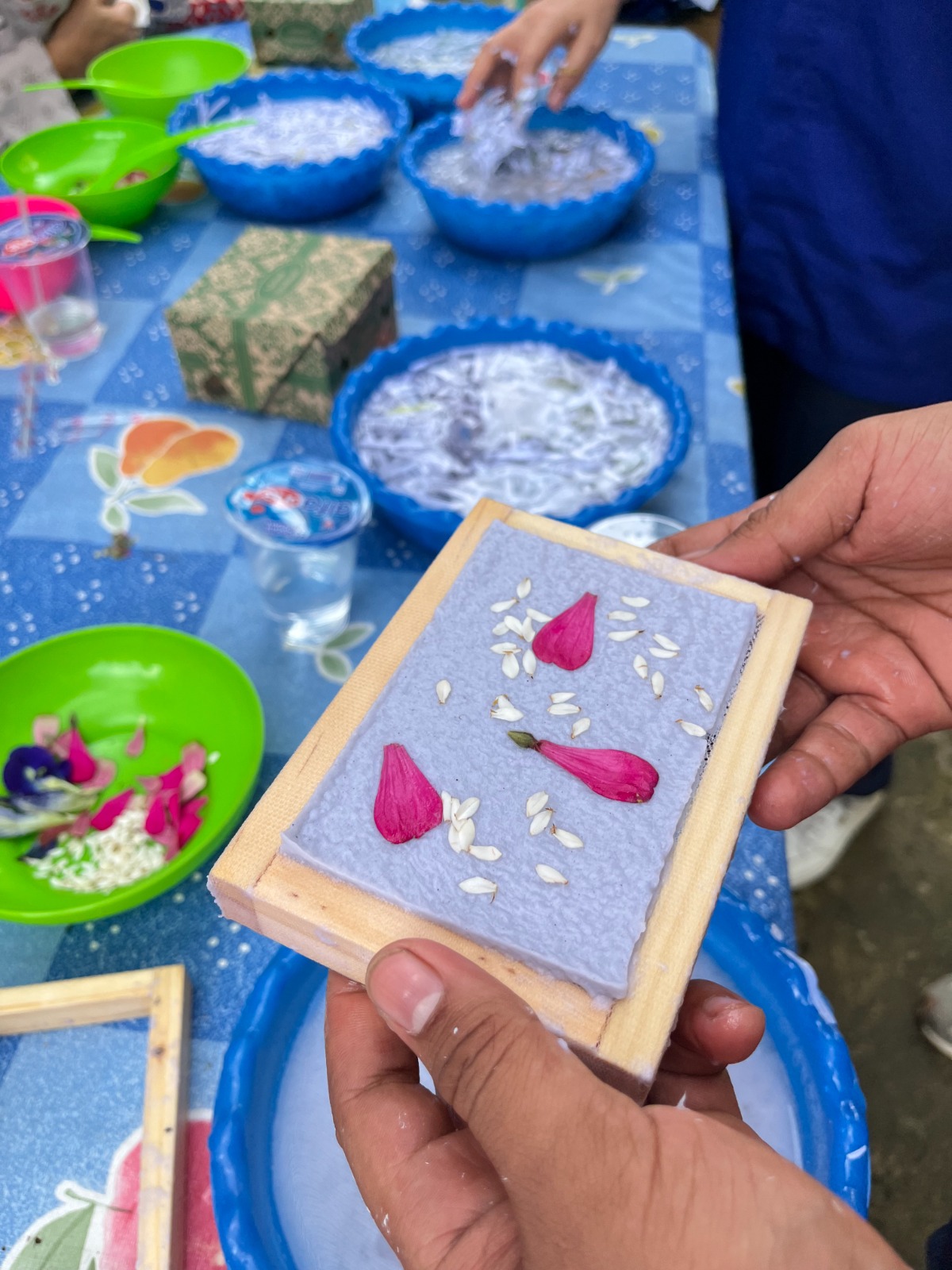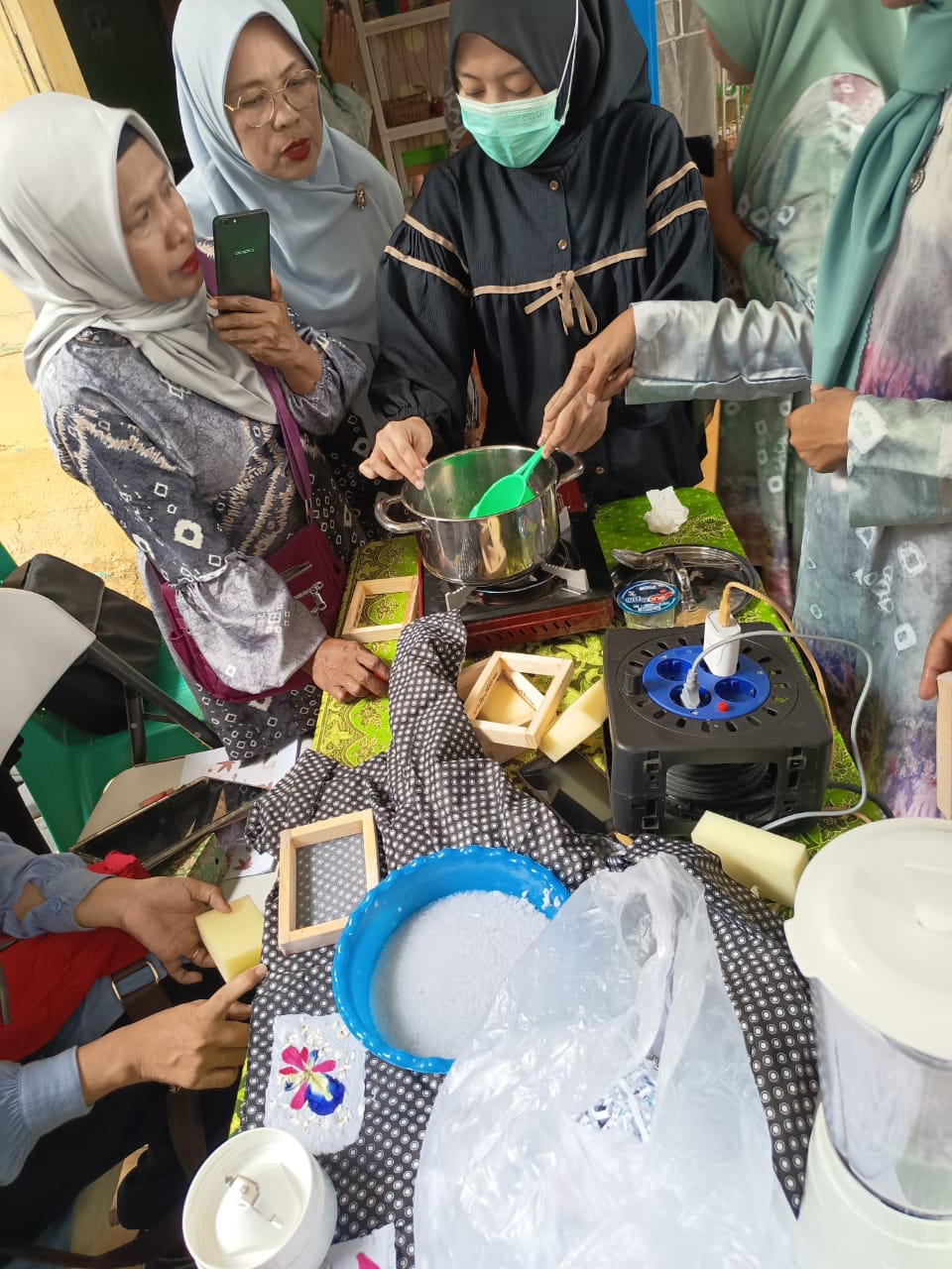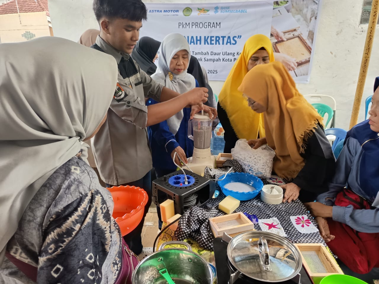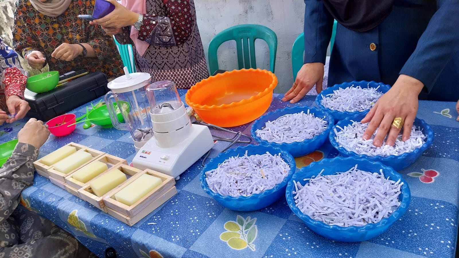 Pada kegiatan Benah Kertas untuk meningkatkan nilai tambah daur ulang kertas pada usaha kreatif kelompok Bank Sampah Kota Palembang, kertas limbah dimanfaatkan kembali menjadi kertas dekoratif untuk digunakan sebagai pembungkus produk sabun padat maupun produk lainnya. Dalam kegiatan ini, pelatihan diberikan kepada perwakilan pesertadari Bank Sampah Kenanga, Bank Sampah Melati, Bank Sampah Amanah, serta Persit Arhanud. Proses pembuatan kertas diawali dengan merendam limbah kertas semalaman, kemudian menghancurkannya hingga menjadi bubur kertas. Bubur tersebut dicampur dengan bahan pengikat dan dicetak menggunakan cetakan berjaring dengan cara ditekan perlahan hingga air berkurang. Setelah dicetak, kertas diberi hiasan kelopak bunga dan dikeringkan hingga menghasilkan kertas daur ulang yang bernilai dekoratif.