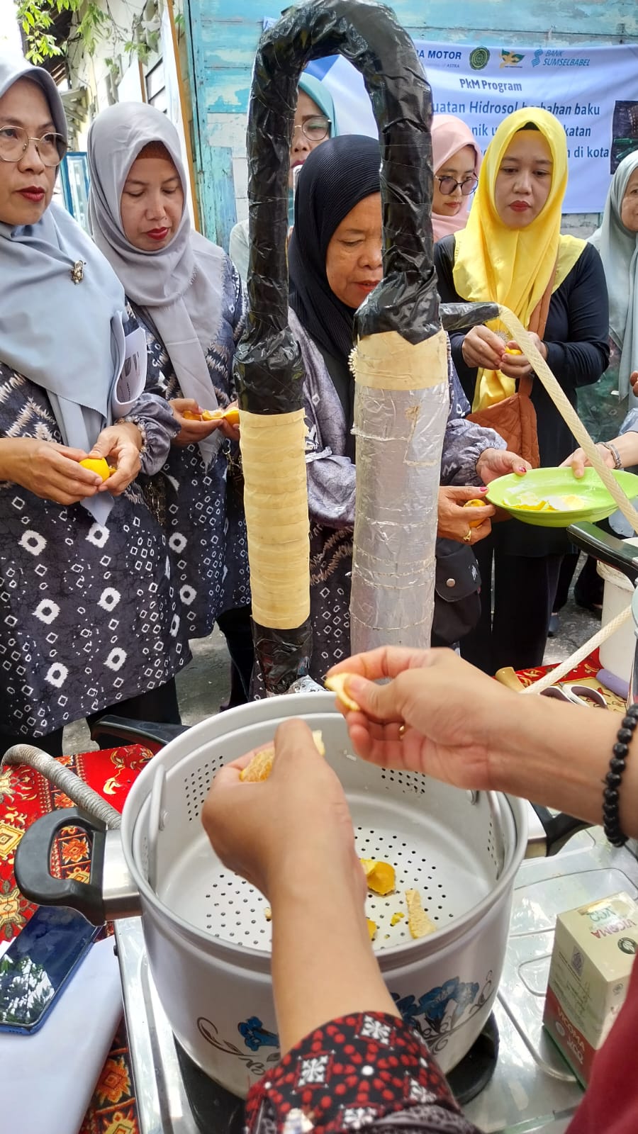 Kegiatan kemudian dilanjutkan dengan pelatihan Pembuatan Hidrosol berbahan baku limbah organik untuk peningkatan kreatifitas kelompok Bank Sampah di Kota Palembang. Pada sesi ini, peserta mendapatkan pelatihan mengenai dua metode destilasi, yaitu destilasi uap dan destilasi air, dengan menggunakan panci presto yang telah dimodifikasi sebagai alat destilasi sederhana. Proses pembuatan dimulai dengan pengecilan ukuran kulit jeruk sebagai bahan baku, kemudian bahan dimasukkan kedalam alat destilasi yang telah diisi air dengan perbandingan 1:4 (kulit jeruk : air) dan dipanaskan perlahan hingga menghasilkan uap air yang mengekstrak senyawa-senyawa esensial dari kulit jeruk. Uap yang terbentuk selanjutnya dialirkan menuju kolom kondensasi, sehingga diperoleh hidrosol serta sedikit essential oil sebagai hasil destilasi. Hidrosol yang dihasilkan dapat dimanfaatkan sebagai pengharum ruangan, semprotkain, repellent serangga, air wangi untuk pembuatan sabun, dan berbagai kebutuhan lainnya.