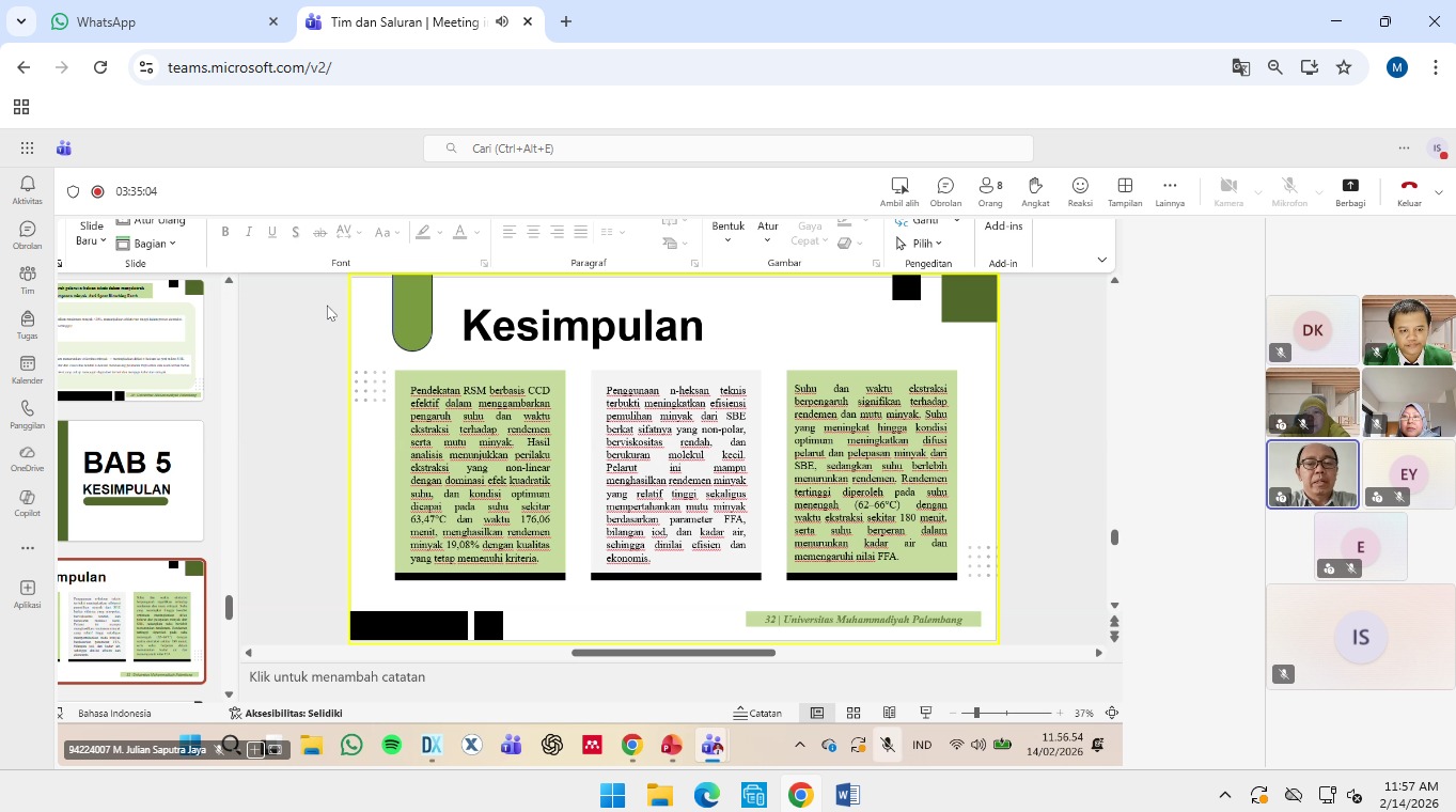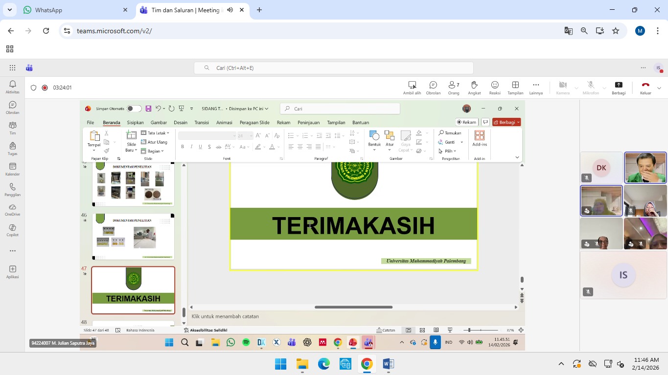 Palembang, 14 Februari 2026 — Program Studi Magister Teknik Kimia pada Universitas Muhammadiyah Palembang kembali menyelenggarakan Ujian Seminar Hasil Tesis sebagai bagian dari proses akademik mahasiswa dalam menyelesaikan studi magister. Kegiatan tersebut dilaksanakan secara daring (online) pada Sabtu, 14 Februari 2026 , pukul 11.00–12.00 WIB, dan berlangsung dengan lancar serta penuh diskusi ilmiah.