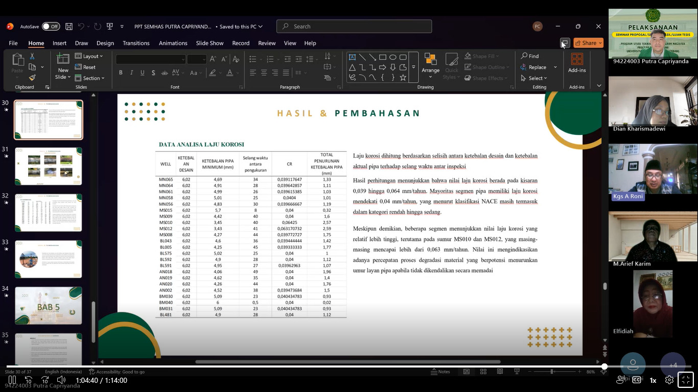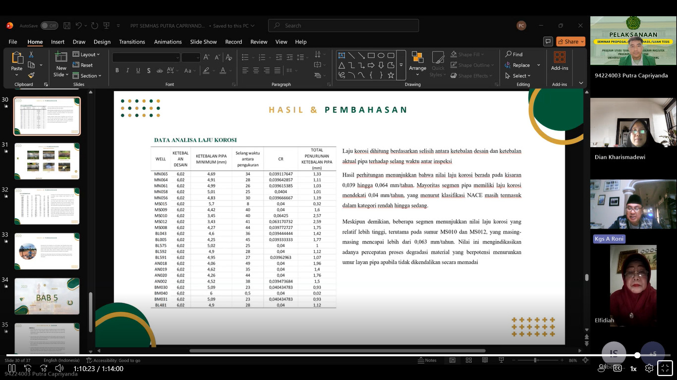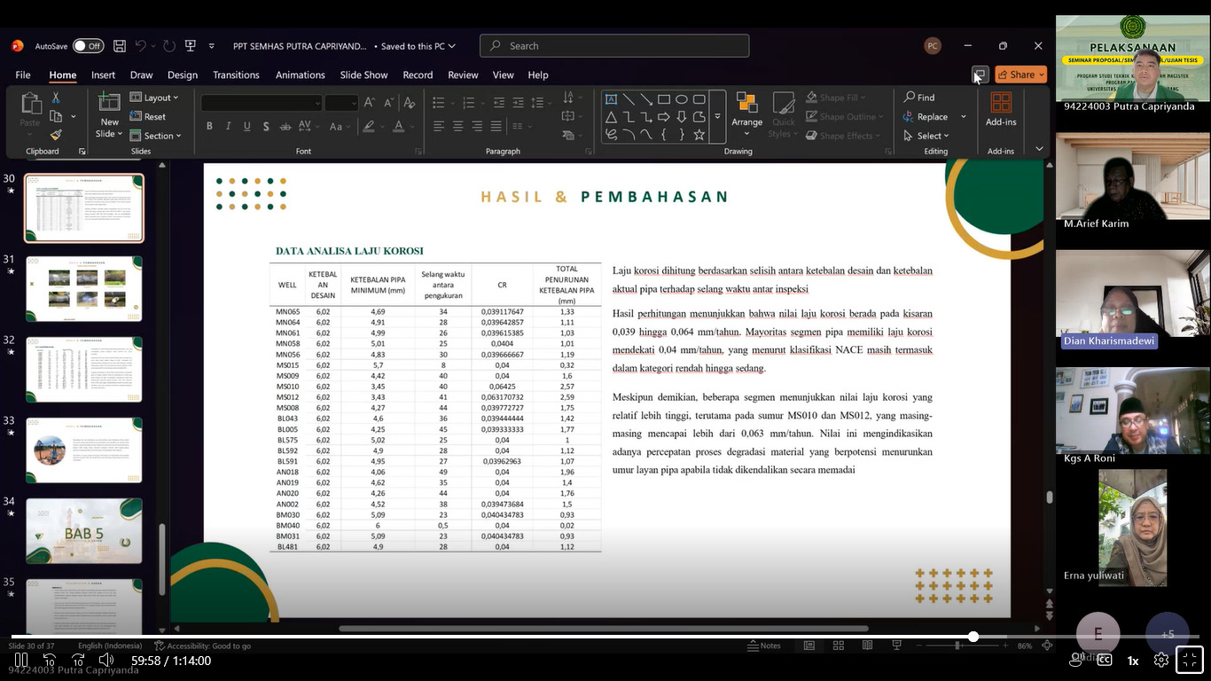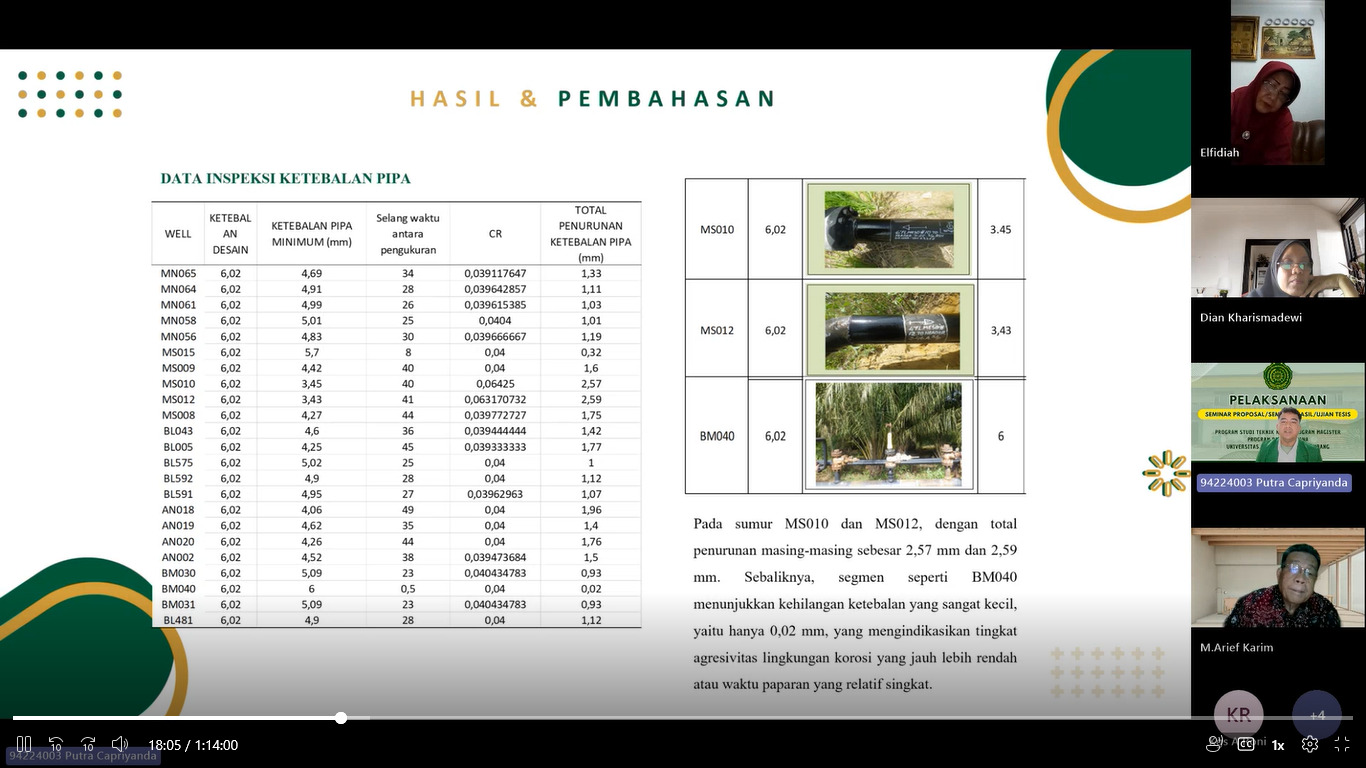 Mahasiswa yang mengikuti ujian seminar hasil tesis tersebut adalah Putra Capriyanda (NIM. 94224003) dengan judul penelitian “Evaluasi Kondisi Korosi Pada Jaringan Pipa Minyak dan Gas Berdasarkan Parameter Operasi dan Komposisi Fluida.”