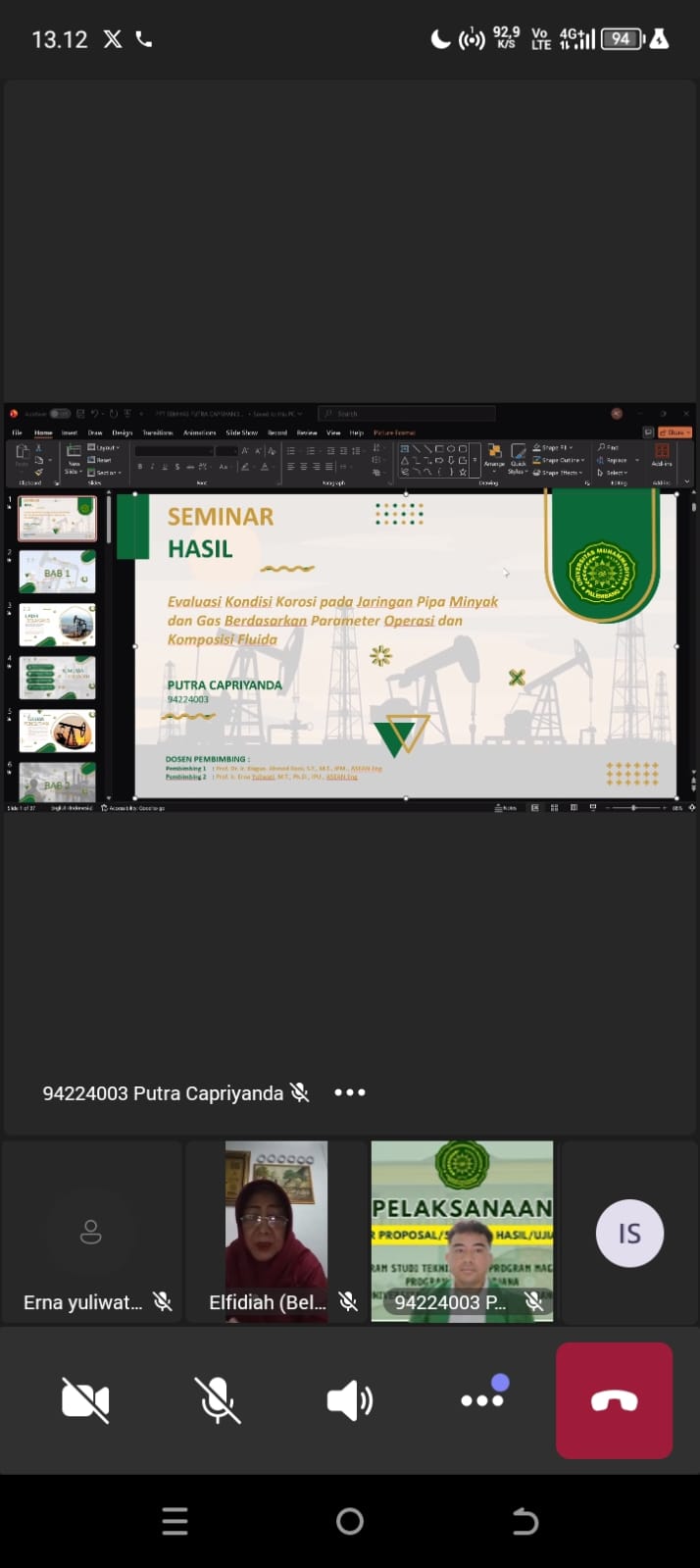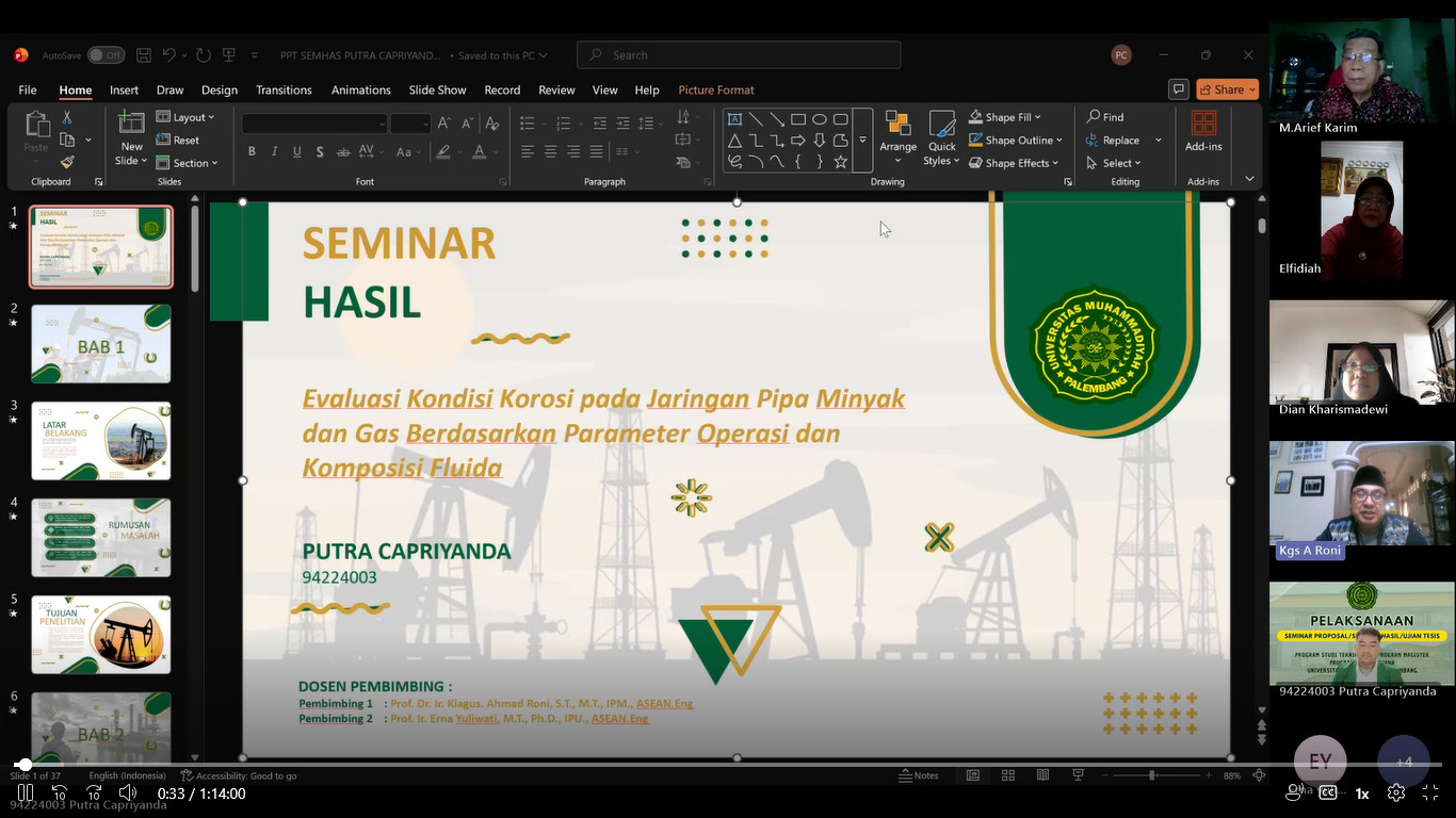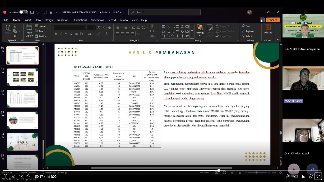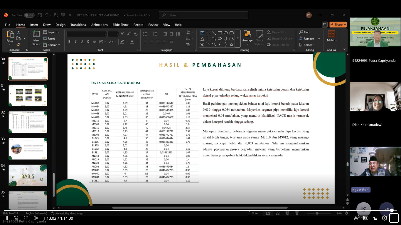Mahasiswa yang mengikuti ujian seminar hasil tesis tersebut adalah Putra Capriyanda (NIM. 94224003) dengan judul penelitian “Evaluasi Kondisi Korosi Pada Jaringan Pipa Minyak dan Gas Berdasarkan Parameter Operasi dan Komposisi Fluida.”
