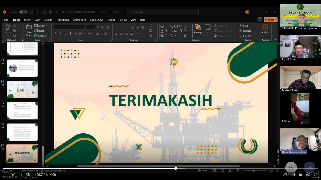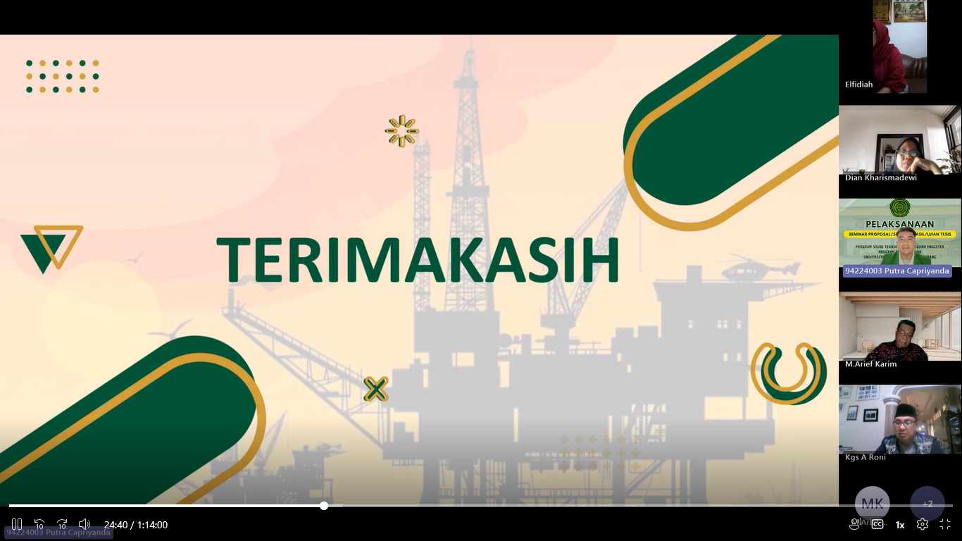 Melalui kegiatan seminar hasil tesis ini, Program Studi Magister Teknik Kimia Pascasarjana Universitas Muhammadiyah Palembang terus menunjukkan komitmennya dalam mendorong penelitian yang aplikatif dan relevan dengan kebutuhan industri , khususnya pada bidang teknik kimia dan energi.