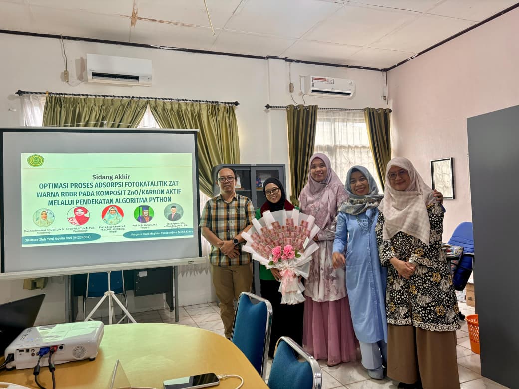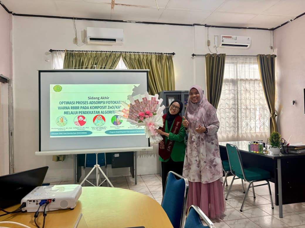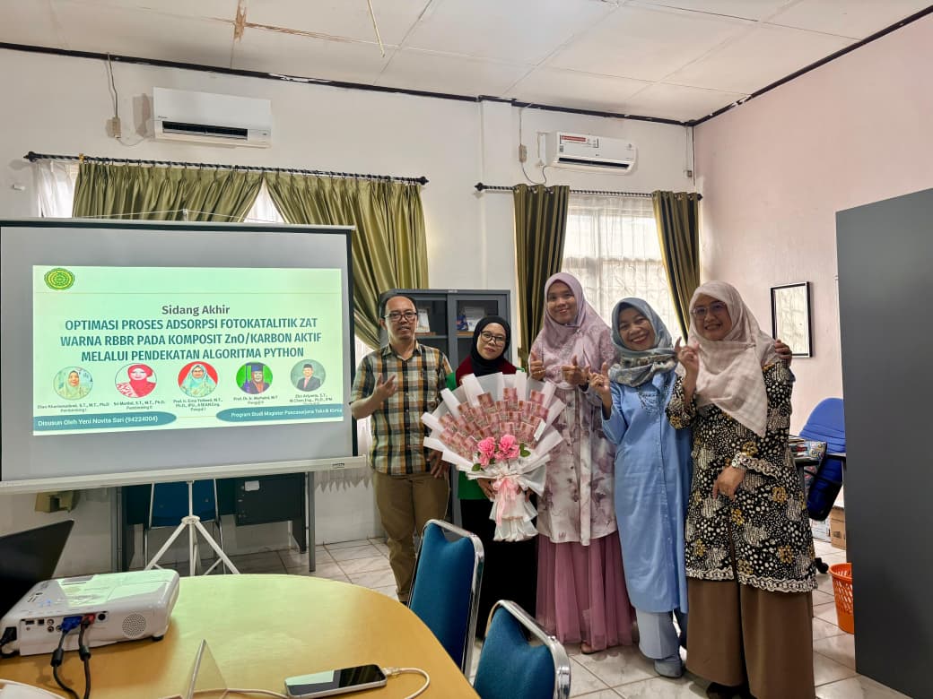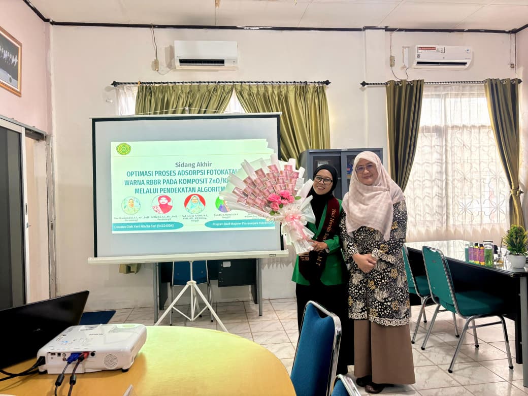 Mahasiswa yang mengikuti ujian tesis pada kesempatan tersebut adalah Yeni Novita Sari (NIM. 94224004) dengan judul penelitian “Optimasi Proses Adsorpsi Fotokatalitik Zat Warna RBBR pada Komposit ZnO/Karbon Aktif melalui Pendekatan Algoritma Python.”