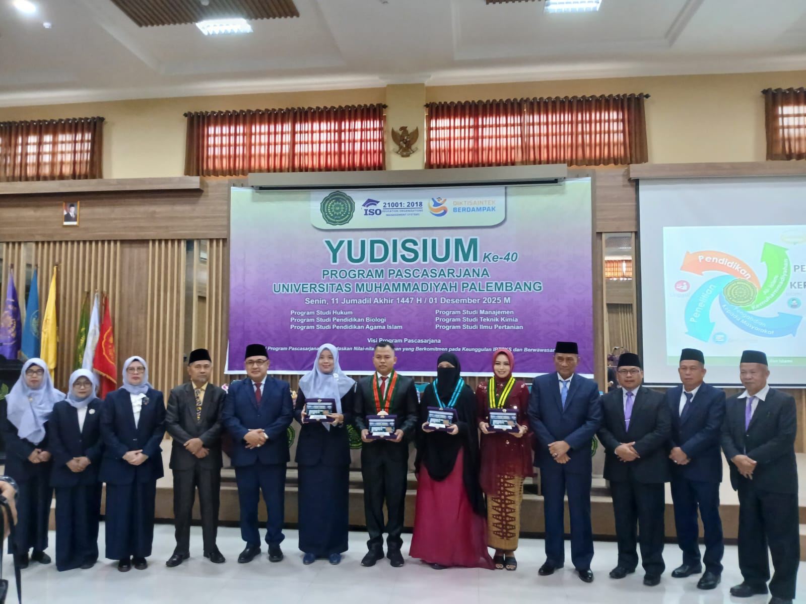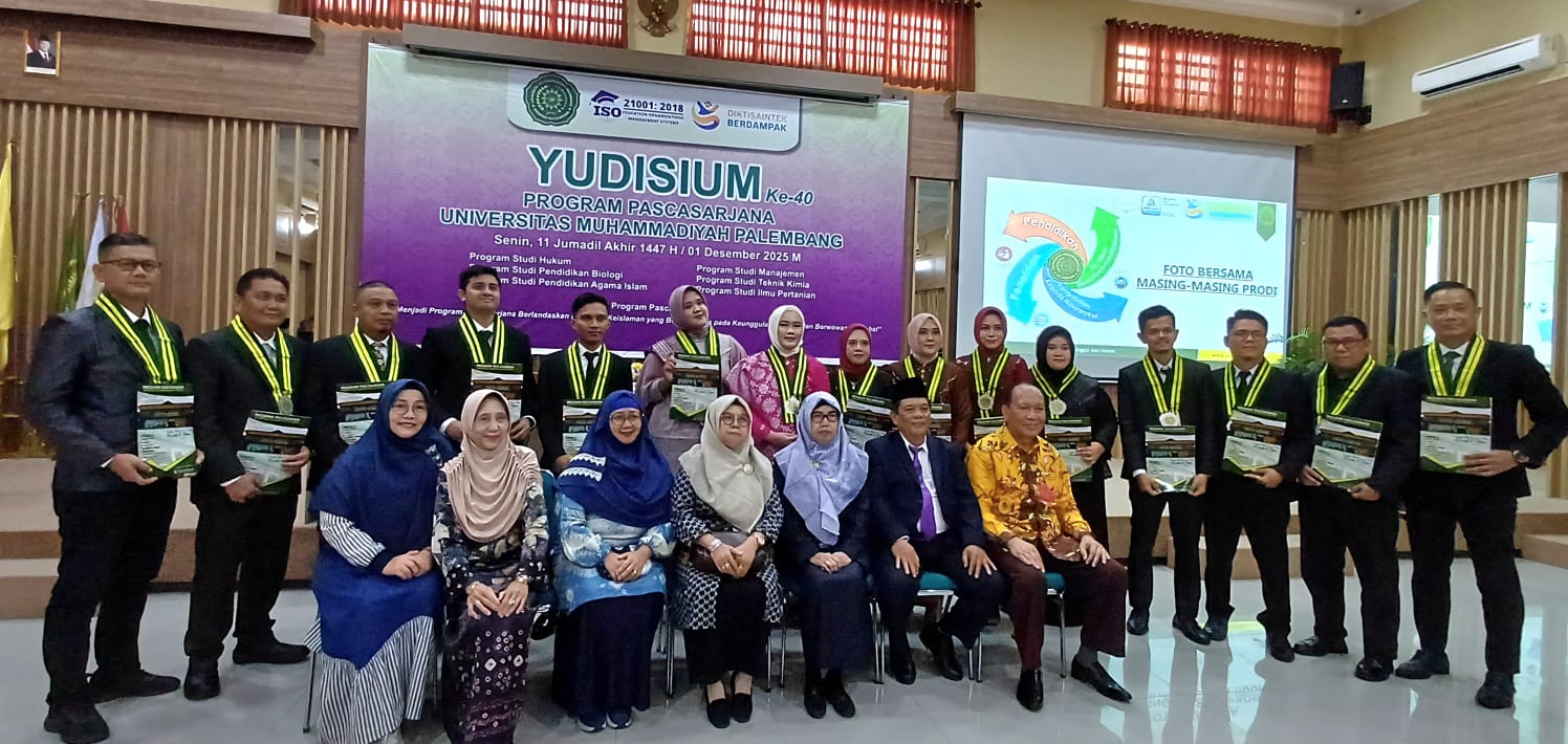 Universitas Muhammadiyah (UM) Palembang dalam hal ini dari Program Pasca Sarjana UM Palembang melaksanakan Yudisium ke 40 untuk program studi (Prodi) Hukum, Pendidikan Biologi, Pendidikan Agama Islam (PAI), Manajemen, Teknik Kimia, dan Ilmu Pertanian. Adapun yudisium ke 40 program pasca sarjana UM Palembang ini sendiri dipusatkan di Aula Gedung KH. Faqih Usman Lantai 7 UM Palembang, Senin (1/12/2025) Adapun turut hadir didalam Yudisium ke 40 Program Pasca Sarjana UM Palembang yakni Direktur Program Pasca Sarjana UM Palembang Dr Ir Mukhtarudin Muchsiri, M.P, Sekretaris Program Pasca Sarjana UM Palembang Dr Sri Wardhani, M.Si, Rektor UM Palembang yang diwakili oleh Wakil Rektor I UM Palembang Prof Dr Ir Kiagus Ahmad Roni, S.T., M.T, Asean.Eng, Pimpinan Wilayah Muhammadiyah (PWM) Sumatera Selatan (Sumsel) H Ridwan Hayatuddin, S.H., M.H, BPH, Bapeda Litbang Kota Palembang, para jajaran dari program pasca sarjana UM Palembang, para mahasiswa dan mahasiswi yang di yudisium, dan para orang tua yang diyudisium.