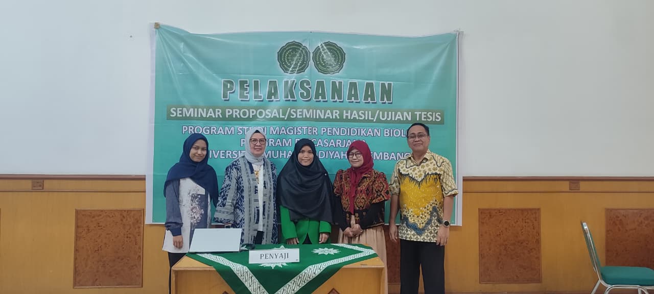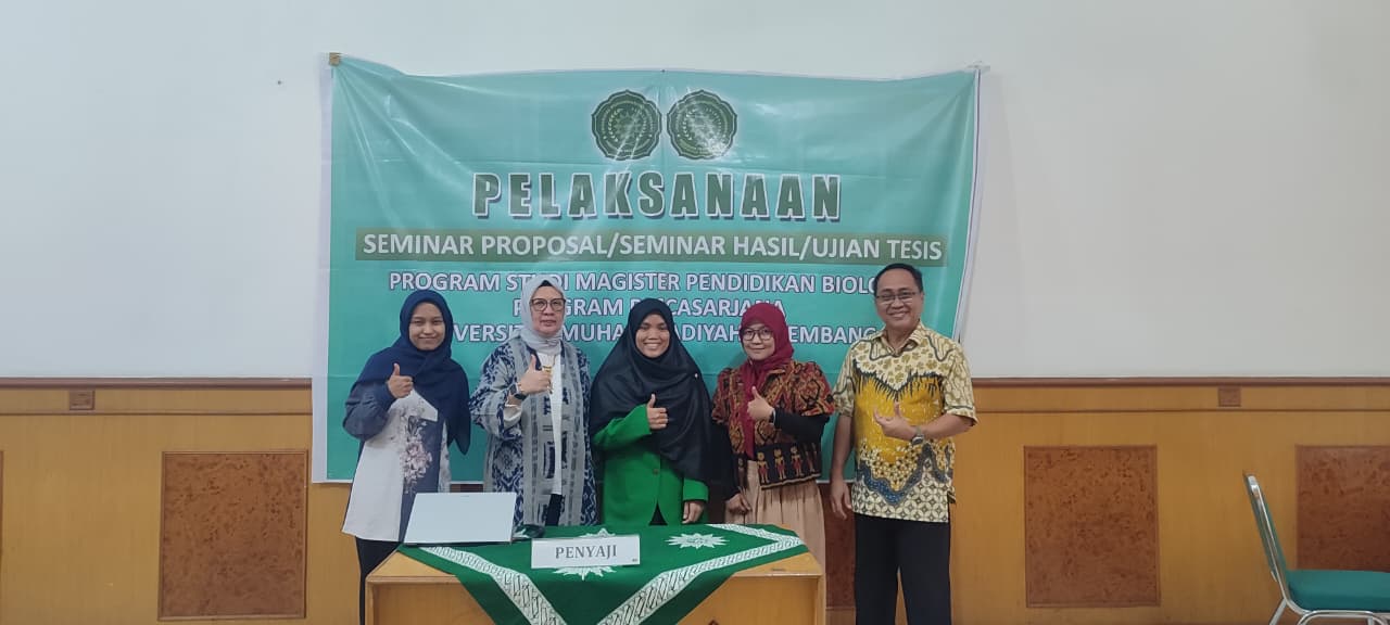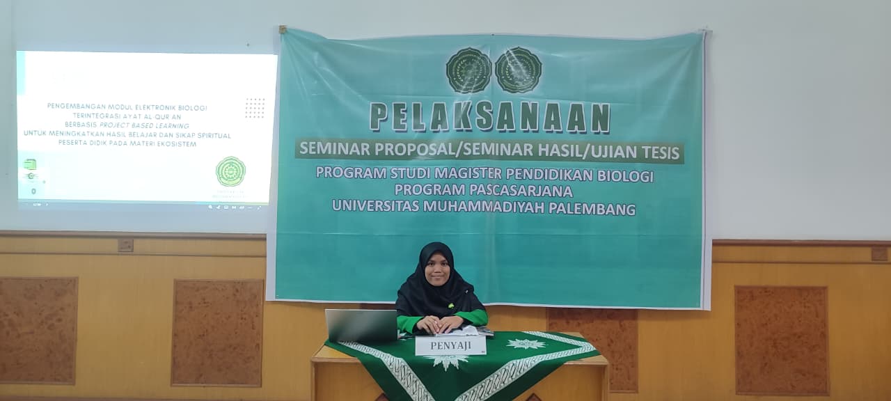 Palembang, 30 Agustus 2025 – Pendidikan Biologi, Program Magister, PPs Universitas Muhammadiyah Palembang sukses menyelenggarakan ujian akhir tesis mahasiswa atas nama Julia Afifah (93221011). Ujian dilaksankan secara tertutup dan offline di Gedung Pascasarjana Lantai 2, mulai pukul 13.00 – 14.30 WIB. Julia Afifah merupakan mahasiswa angkatan VIII yang berhasil menyelesaikan tesis dengan judul “Pengembangan Modul Elektronik Biologi Terintegrasi Ayat Al-Quran Berbasis Project-Based Learning untuk Meningkatkan Hasil Belajar dan Sikap Spiritual Peserta Didik Pada Materi Ekosistem”. Naskah tesis dan perangkat yang digunakan selama penelitian disusun dengan arahan dan bimbingan Dr. Sri Wardhani, M.Si., dan Dr. Me;i Astriani, M.Si. Adapun Dosen penguji lain yang terlibat dalam kegiatan ujian adalah Dr. Saleh Hidayat, M.Si., Dr. Marlina Ummas Genisa, M.Si., dan Dr. Wulandari Saputri, M.Pd. Penelitian dilakukan di SMA Islam Terpadu Raudhatul Ulum dengan tujuan untuk mengembangkan menghasilkan modul Terintegrasi Ayat Al-Quran Berbasis Project-Based Learning yang valid, praktis, dan efektif untuk meningkatkan hasi belajar dan sikap spiritual.