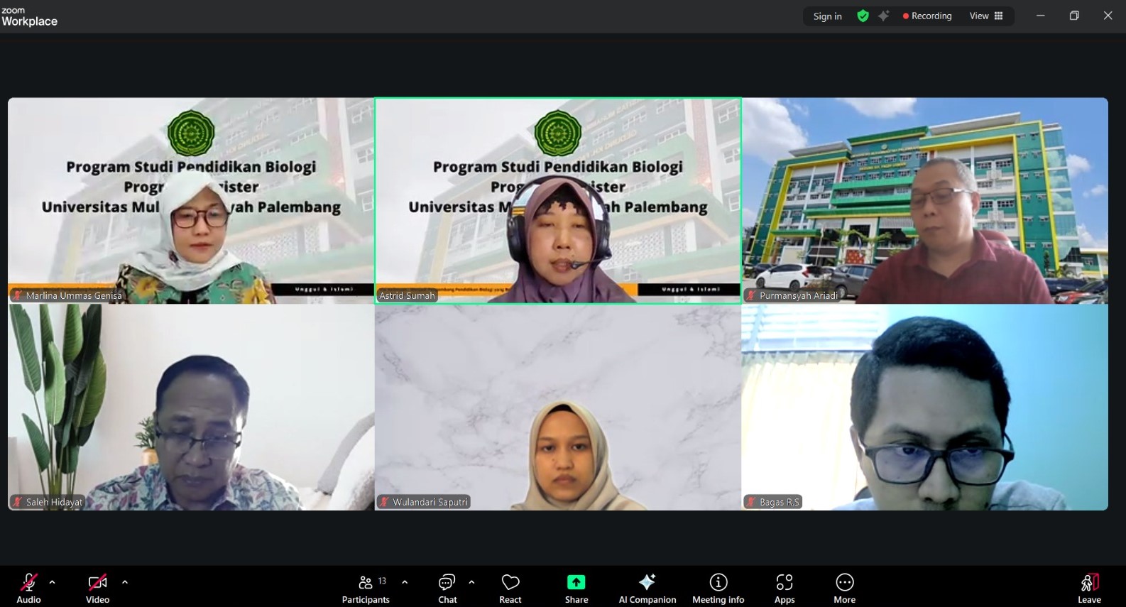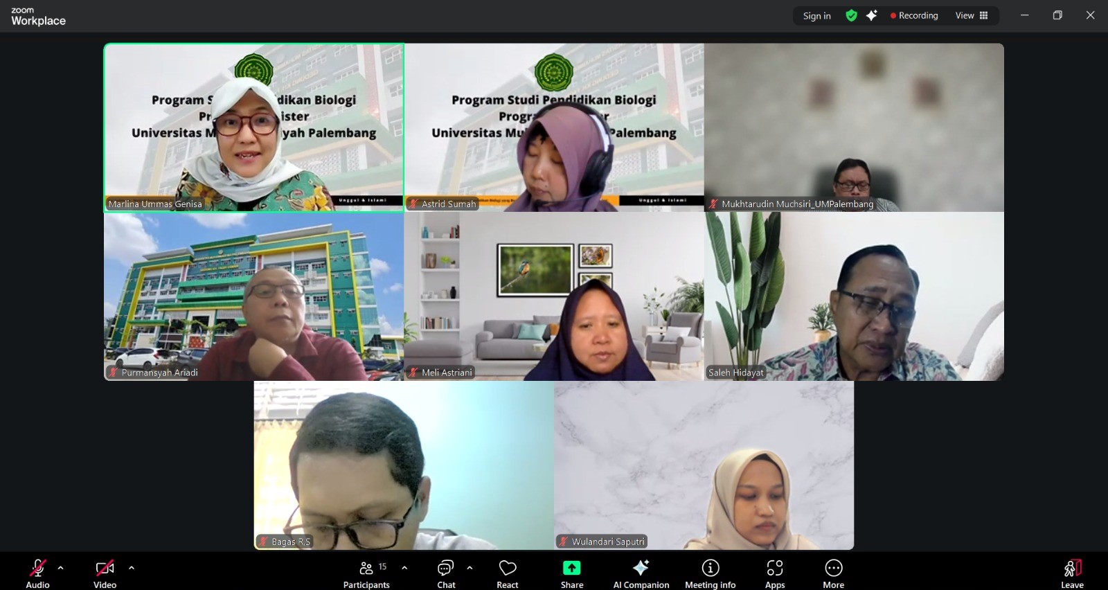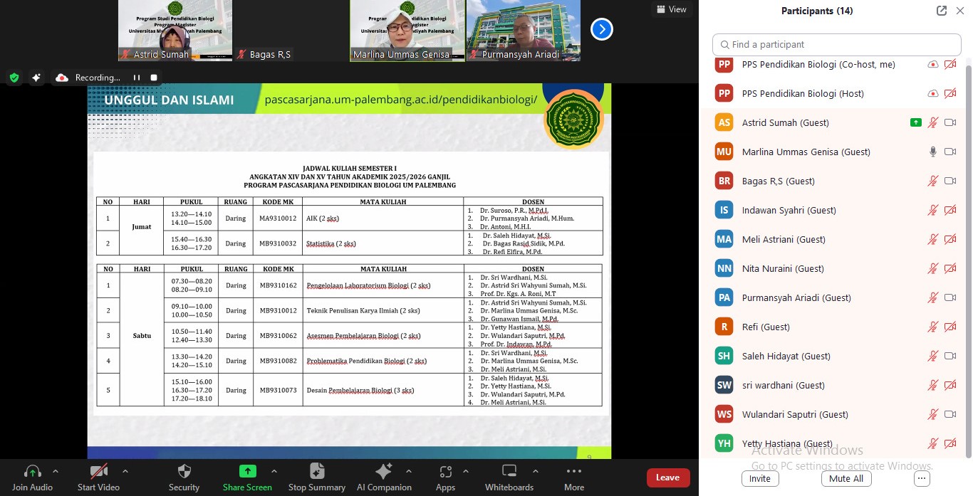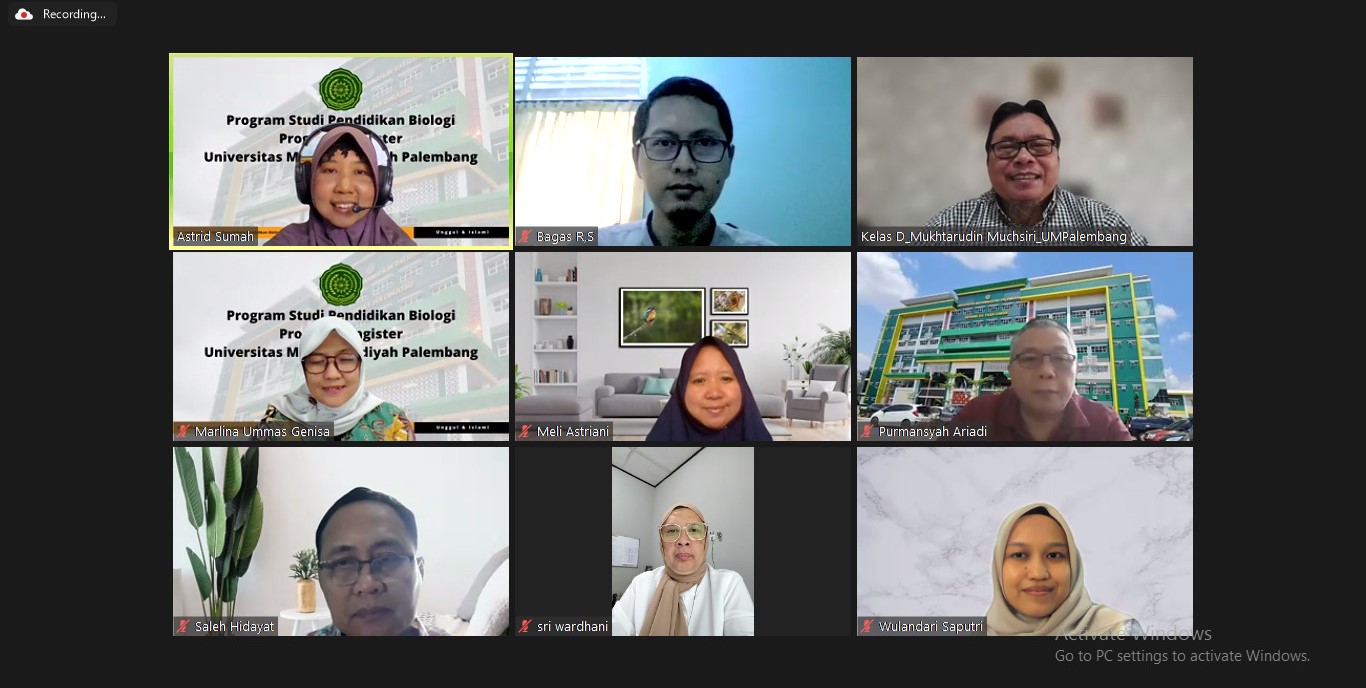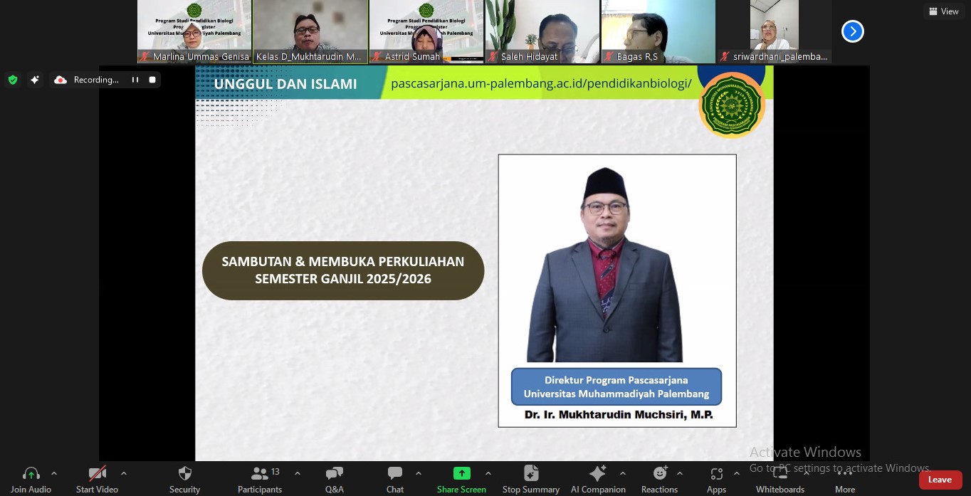 Palembang, 18 September 2025 – Program Studi Pendidikan Biologi, Program Magister, PPs Universitas Muhammadiyah Palembang menyelenggarakan rapat awal pembukaan perkuliahan Semester Genap, Tahun Akademik 2024/2025. Rapat awal perkuliahan merupakan agenda rutin yang dilakukan untuk menyambut dan mempersiapkan pembelajaran yang akan dilaksanakan. Rapat awal perkuliahan dilaksanakan secara online, melalui aplikasi zoom meeting mulai pukul 13.30 WIB – selesai. Kegiatan rapat dibuka langsung oleh Direktur Pascasarjana, Dr. Ir. Mukhtarudin Muchsiri, M.P. dan dilanjutkan paparan oleh Ketua Program Studi, Dr. Marlina Ummas Genisa, M.Sc. Dalam sambutannya, Direktur Pascasarjana tak lupa mengingatkan Program Studi Pendidikan Biologi agar senantiasa melakukan evalusi pembelajaran yang telah dilakukan untuk meningkatkan kuallitas pembelajaran selanjutnya. Direktur juga menambahkan perlunya untuk mengintegrasikan hasil penelitian dan pengabdian kepada masyarakat dalam mata kuliah yang disampaikan, serta nilai-nilai keislaman selama proses pembelajaran.