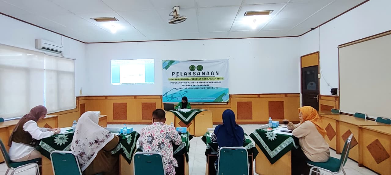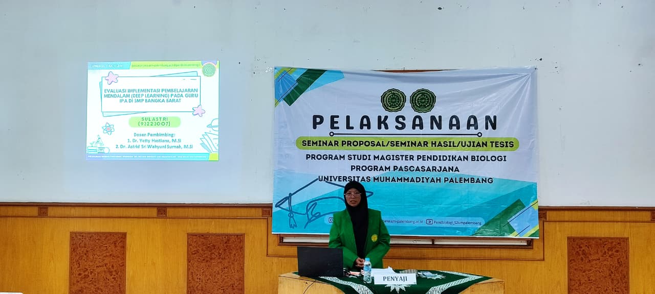 Palembang, 04 November 2025 – Pendidikan Biologi, Program Magister, PPs Universitas Muhammadiyah Palembang menyelenggarakan seminar proposal tesis mahasiswa atas nama Sulastri (93223007). Sulastri merupakan mahasiswi S2 Pendidikan Biologi angkatan XII yang telah menyusun proposal dengan judul “Evaluasi Implementasi Pembelajaran Mendalam (Deep Learning) pada Guru IPA SMP di Bangka Barat. Seminar proposal tesis dilaksanakan secara offline mulai pukul 08.00 – 09.30 WIB, di Ruang 2 Gedung Program Pascasarjana Lantai 2. Pembimbing utama Sulastri dalam menyusun proposal adalah Dr. Yetty Hastiana, M.Si., dan Dr. Astrid S. W. Sumah, M.Si., sedangkan tim penelaah terdiri atas Dr. Saleh Hidayat, M.Si., Dr. Meli Astriani, M.Si., dan Dr. Sri Wardhani, M.Si.