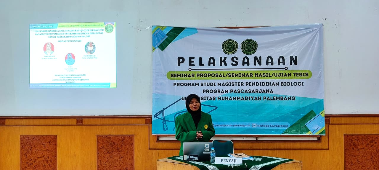 Palembang, 04 November 2025 – Pendidikan Biologi, Program Magister, PPs Universitas Muhammadiyah Palembang menyelenggarakan seminar proposal tesis mahasiswa atas nama Umi Nadifah (93224004). Proposal tesis yang disusun berjudul “Pengembangan Media Ajar 3D Dilengkapi QR Code Berbasis PBL Pada Materi Sistem Gerak Untuk Meningkatkan Pemahaman Konsep dan Kolaborasi Siswa SMA/MA”. Seminar proposal tesis dilaksanakan secara offline mulai pukul 09.30 – 11.00 WIB, di Ruang 2 Program Pascasarjana Lantai 2. Pembimbing utama proposal adalah Dr. Meli Astriani, M.Si., dan Dr. Sri Wardhani, M.Si. Penelaah yang turut hadir dalam kegiatan seminar proposal ini antara lain: Dr. Saleh Hidayat, M.Si., Dr. Astrid S. W. Sumah, M.Si., dan Dr. Marlina Ummas Genisa, M.Sc.
