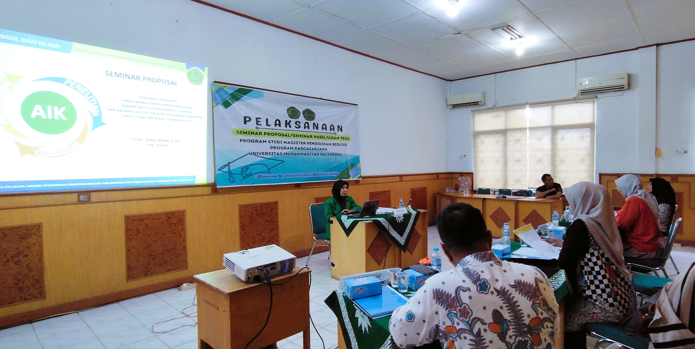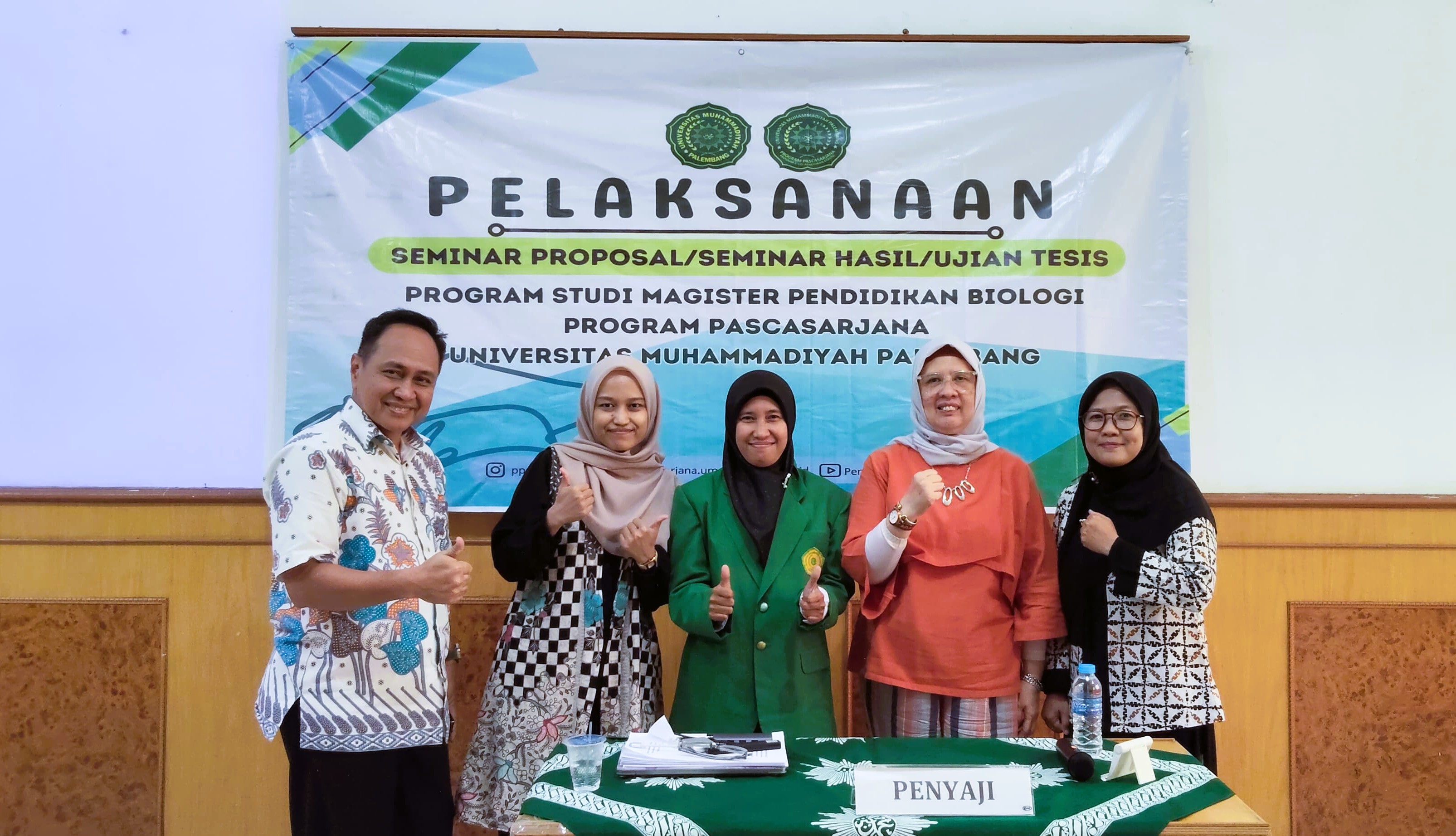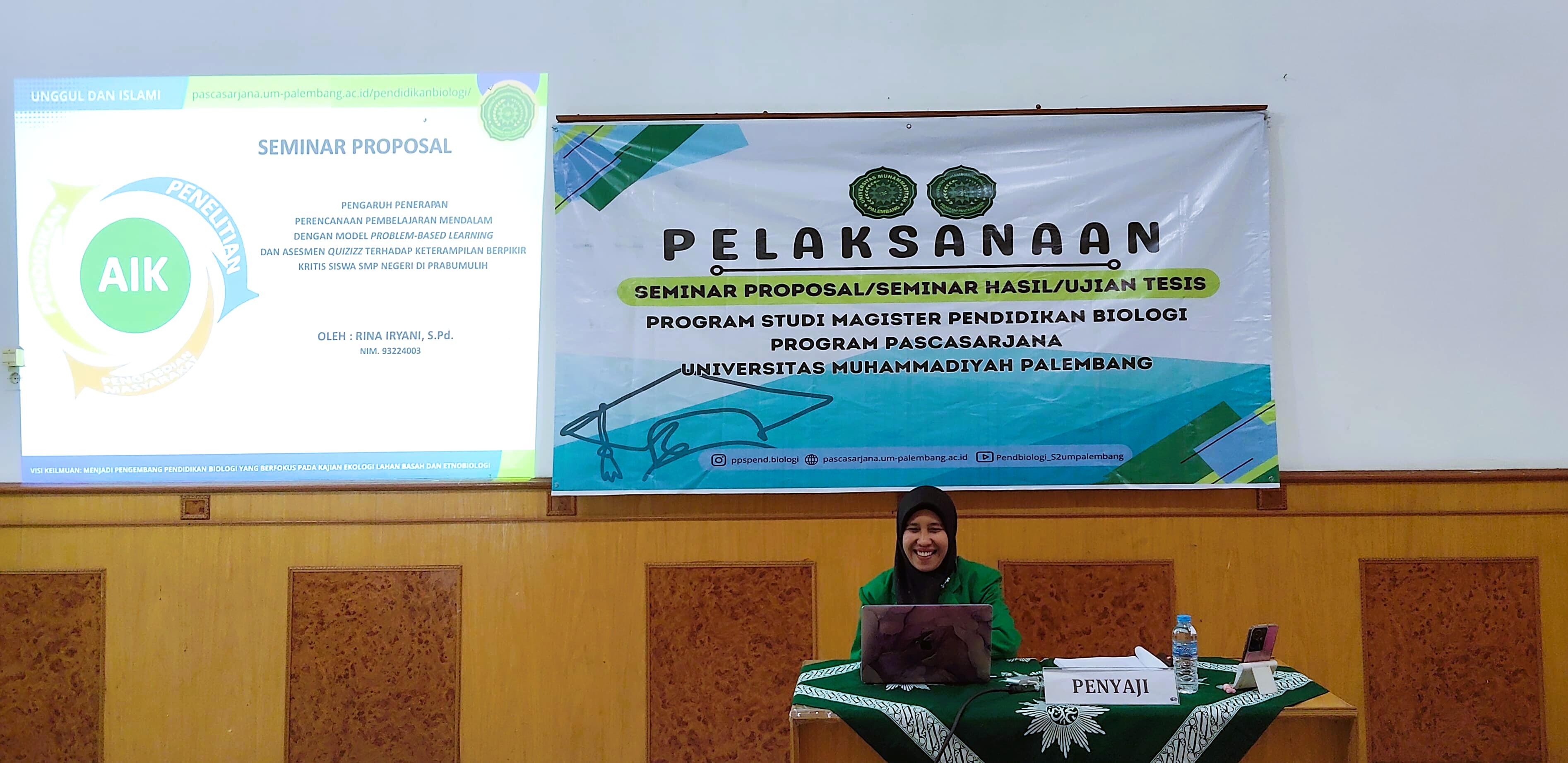 Palembang, 13 November 2025 – Pendidikan Biologi, Program Magister, PPs Universitas Muhammadiyah Palembang menyelenggarakan seminar proposal tesis mahasiswa atas nama Rina Iryani (93224003). Rina Iryani merupakan mahasiswa angkatan XIV dan berhasil menyelesaikan proposal tesis dibimbing oleh Dr. Saleh Hidayat, M.Si., dan Dr. Wulandari Saputri, M.Pd. Adapun proposal tesis yang ditulis berjudul “Pengaruh Penerapan Perencanaan Pembelajaran Mendalam dengan Model Problem Based Learning dan Asesmen Quizizz Terhadap Keterampilan Berpikir Kritis Siswa SMP Negeri di Prabumulih”. Kegiatan seminar proposal dilaksanakan secara offline, di Ruang Ujian Pascasarjana Lantai 2, mulai pukul 13.00 – 15.00 WIB. Adapun penelaah yang terlibat antara lain: Dr. Yetty Hastiana, M.Si., Dr. Sri Wardhani, M.Si., dan Dr. Marlina Ummas Genisa, M.Sc.