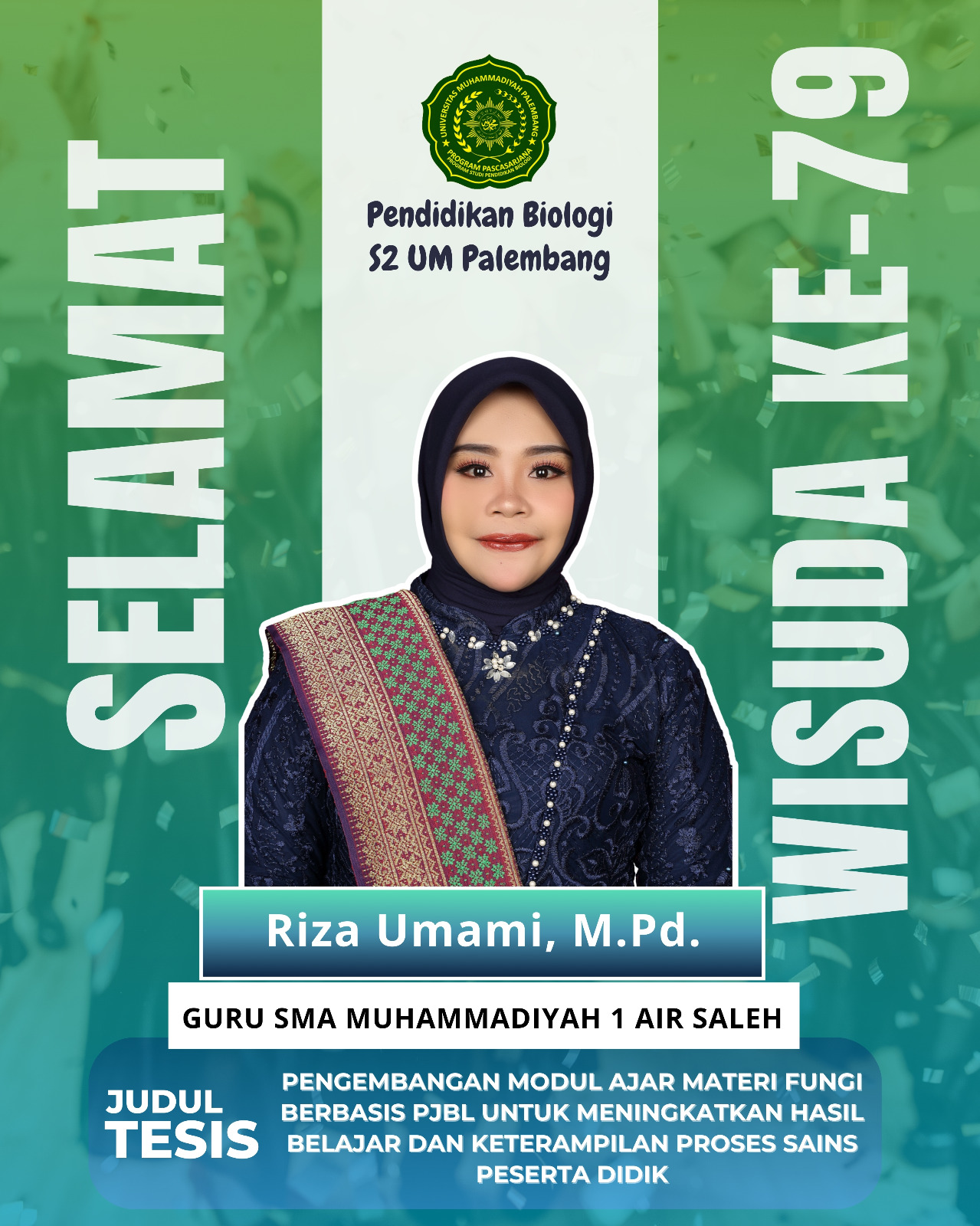 Riza Umami merupakan wisudawan dengan semangat tinggi dalam menyelesaikan studi. Riza berhasil meraih IPK 4.00 dan aktif mengabdi menjadi Guru di SMA Muhammadiyah 1 Air Saleh. Pengalaman selama belajar dan mengikuti bebagai kegiatan ilmiah memberikan inspirasi dalam mengembangkan produk inovatif yang berupa Modul Ajar Materi Fungi Berbasis PjBL untuk Meningkatkan Hasil Belajar dan Keterampilan Proses Sains Peserta Didik.