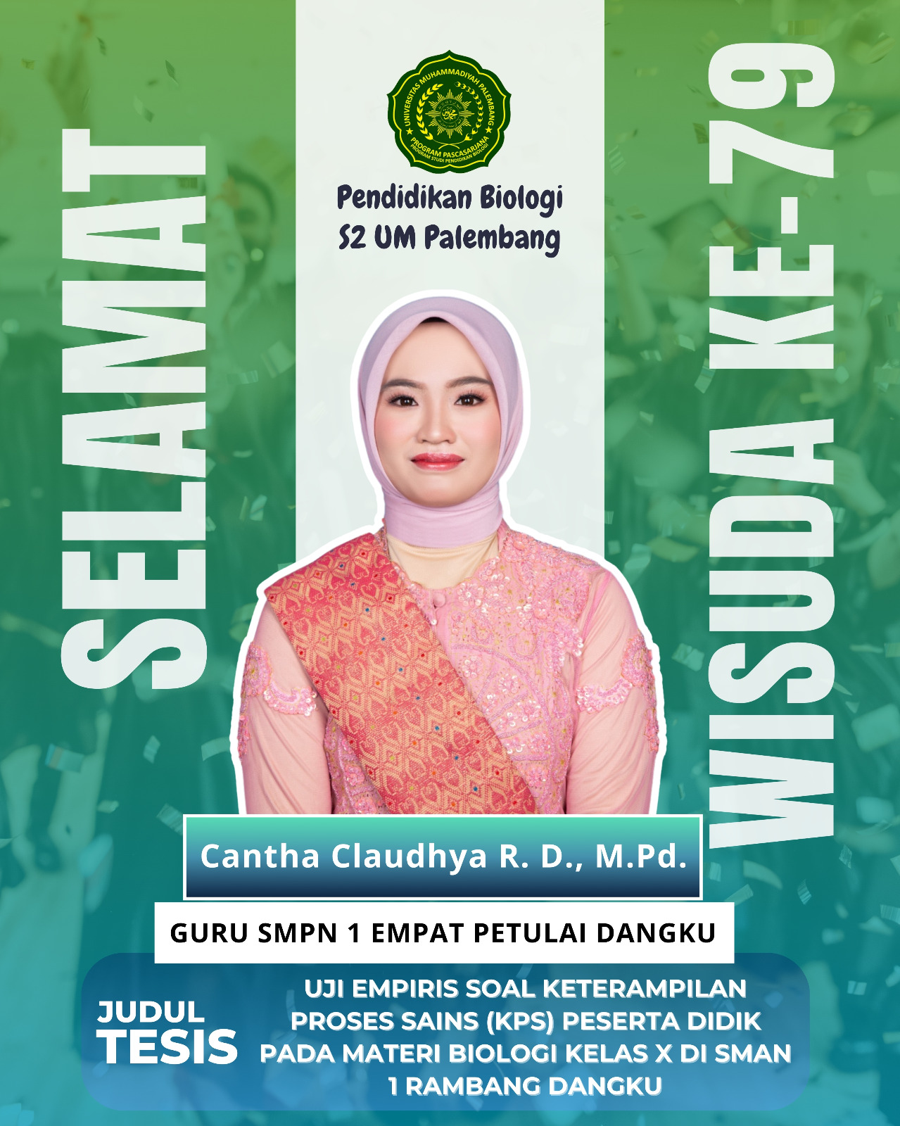 Cantha Claudhya merupakan wisudawan PPs Pendidikan Biologi selanjutnya yang juga aktif menjadi guru di SMPN 1 Empat Petulai Dangku. Meski jarak antara tempat tinggal dan tempat studi jauh, hal itu tidak menyurutkan semangat Cantha dalam untuk menyelesaikan studi. Hal ini terbukti dari IPK yang berhasil diraih yakni 4.00. Pengalaman mengajar di Sekolah mendorong Chantha memaksimalkan keterampilan proses sains peserta didik, sehingga dilakukan uji empiris soal KPS yang relevan pada materi biologi.