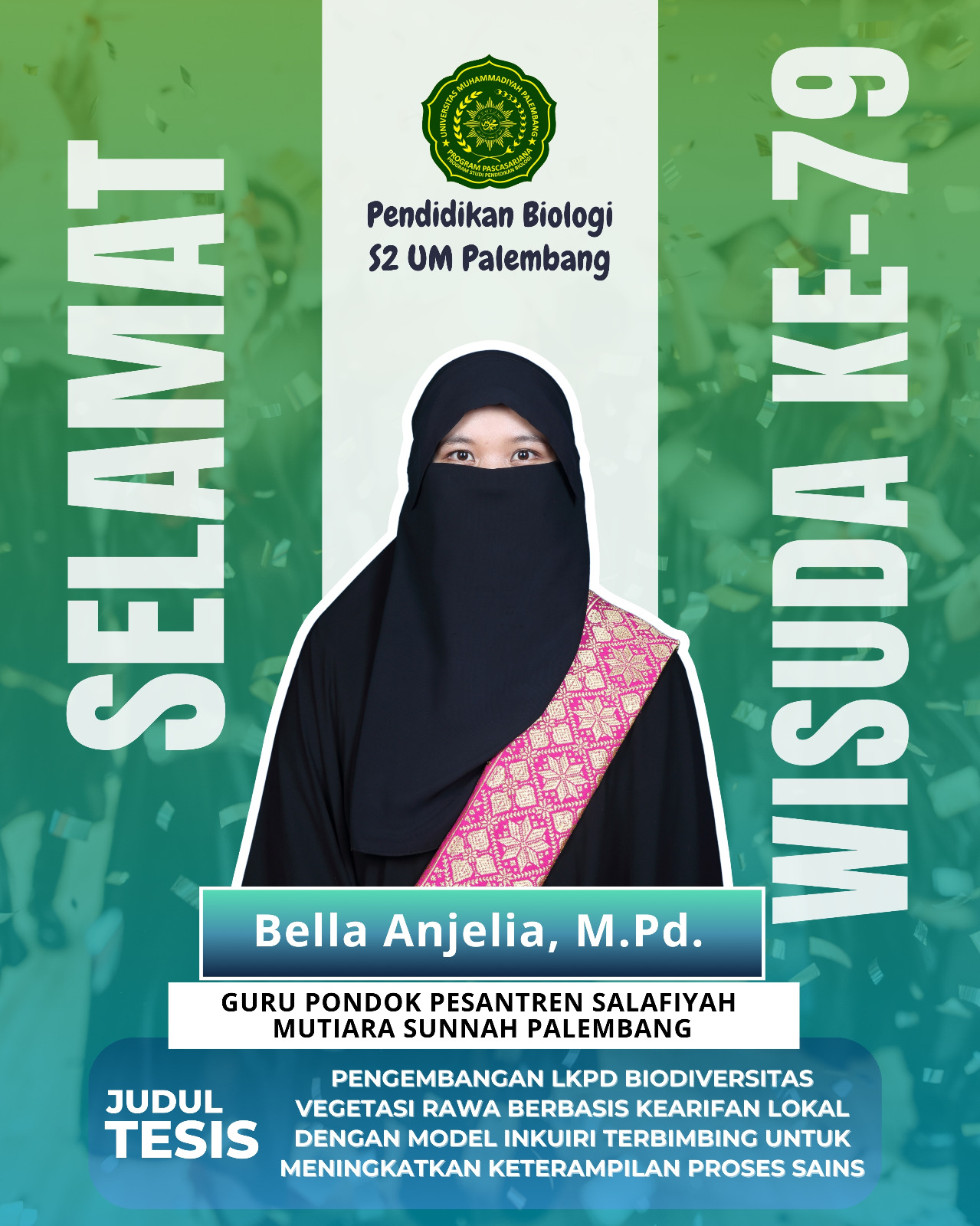Bella Anjelia berhasil menyelesaikan studi dengan kurun waktu 1.4 tahun dan mengembangkan produk penelitian berupa LKPD Biodiversitas Vegetasi Rawa Berbasis Kearifan Lokal dengan Model Inkuiri Terbimbing untuk Meningkatkan Keterampilan Proses Sains. Bella Anjeli menjadi satu wisudawan dengan predikat alumni terbaik, dengan IPK 4.00, dan aktif mengajar di Pondok Pesantren Salafiyah Mutiara Sunnah Palembang.