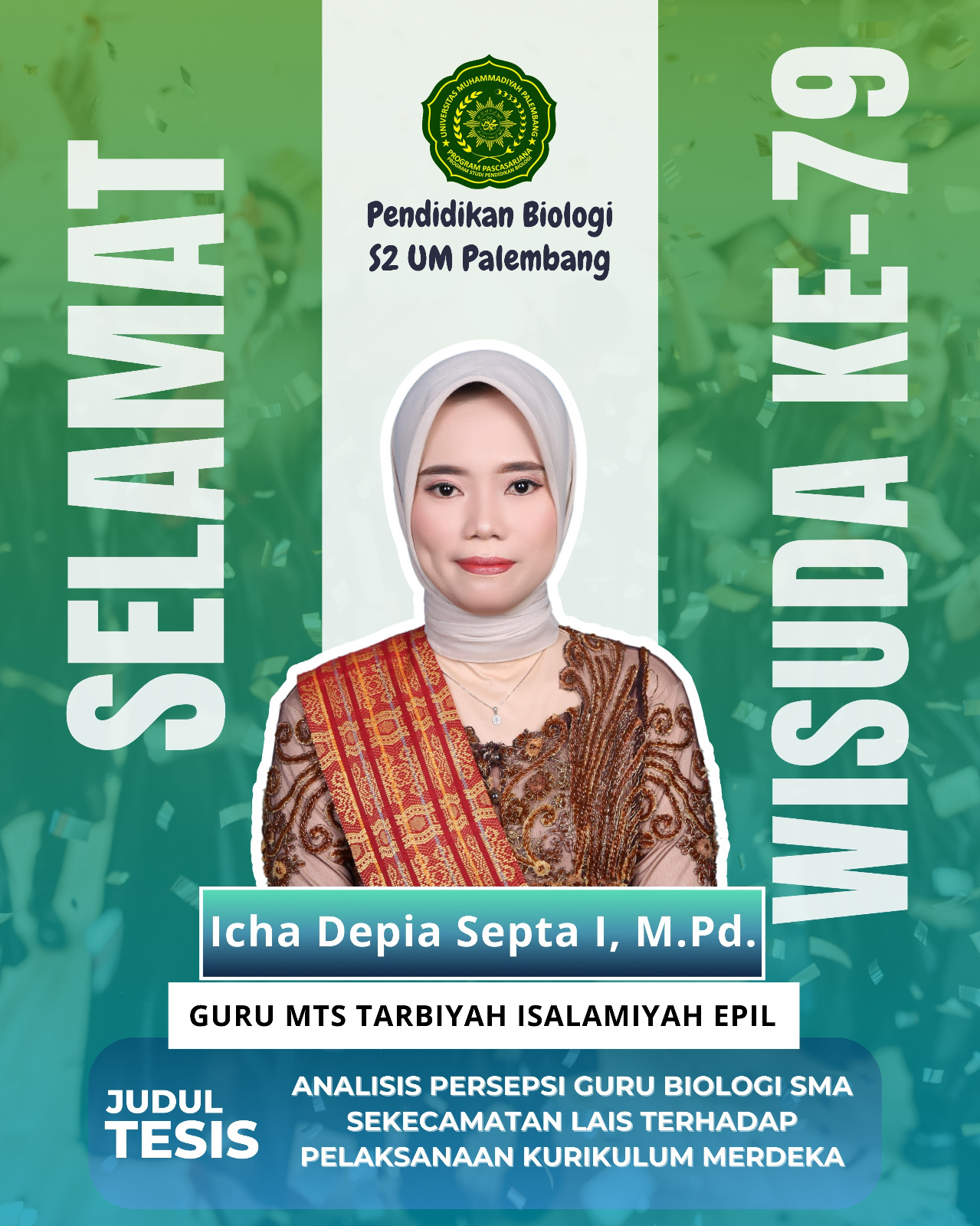 Palembang, 1 Desember 2025 – Tujuh mahasiswa Pendidikan Biologi, Program Magister, PPs Universitas Muhammadiyah Palembang akan mengikuti Wisuda Ke-79, tanggal 03 Desember 2025 di Grand Ballroom Hotel Wyndham Palembang. Para wisudawan berhasil menyelesaikan studi dengan semangat tinggi dan jiwa pendidik yang kuat, khususnya dalam mengembangkan berbagai inovasi, mulai dari media pembelajaran berbasis teknologi, modul interaktif, hingga analisis pembelajaran dan berbagai keterampilan abad 21. Karya-karya inovatif yang dikembangkan para mahasiswa Magister Pendidikan Biologi UM Palembang telah membuktikan bahwa inovasi bukan hanya gagasan, tetapi langkah nyata yang mampu mengubah pembelajaran menjadi lebih bermakna. Ketua Program Magister Pendidikan Biologi UM Palembang, Dr Marlina Ummas Genisa, M.Sc dengan bangga mengucapkan selamat dan mengantarkan para wisudawan terbaiknya memasuki babak baru dalam perjalanan akademik dan profesional. Para wisudawan ini bukan hanya sekadar lulusan, melainkan inovator yang telah menunjukkan kreativitas dan komitmen dalam menciptakan produk pembelajaran yang menarik, dan menyenangkan. Beliau juga berpesan bahwa “semua pengalaman dan pembelajaran yang diperoleh selama menempuh pendidikan diharapkan dapat memberikan kontribusi dan kontribusi dan cahaya baru bagi masa depan pembelajaran biologi. Teruslah berkarya, menginspirasi, dan menjadi agen perubahan di setiap ruang kelas yang kalian pijak”.