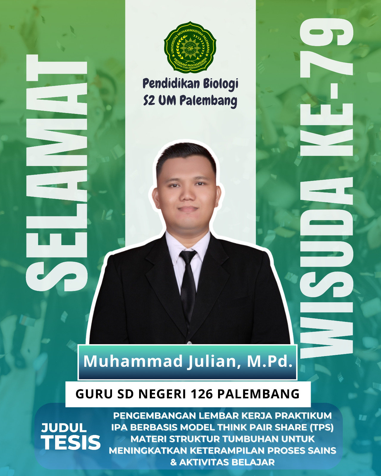 Muhammad Julian merupakan wisudawan PPs Pendidikan Biologi yang juga aktif menjadi guru di SD Negeri 126 Palembang. Pengalaman menjadi seorang guru menginspirasi Julian menghasilkan produk yang bermanfaat dan membantu siswa di kelas, yakni Lembar Kerja Praktikum IPA Berbasis Model Think Pair Share (TPS) Materi Struktur Tumbuhan untuk Meningkatkan Keterampilan Proses Sains dan Aktivitas Belajar. Selanjutnya, Julian juga berhasil meraih IPK 3.60 dengan penuh perjuangan maksimal.