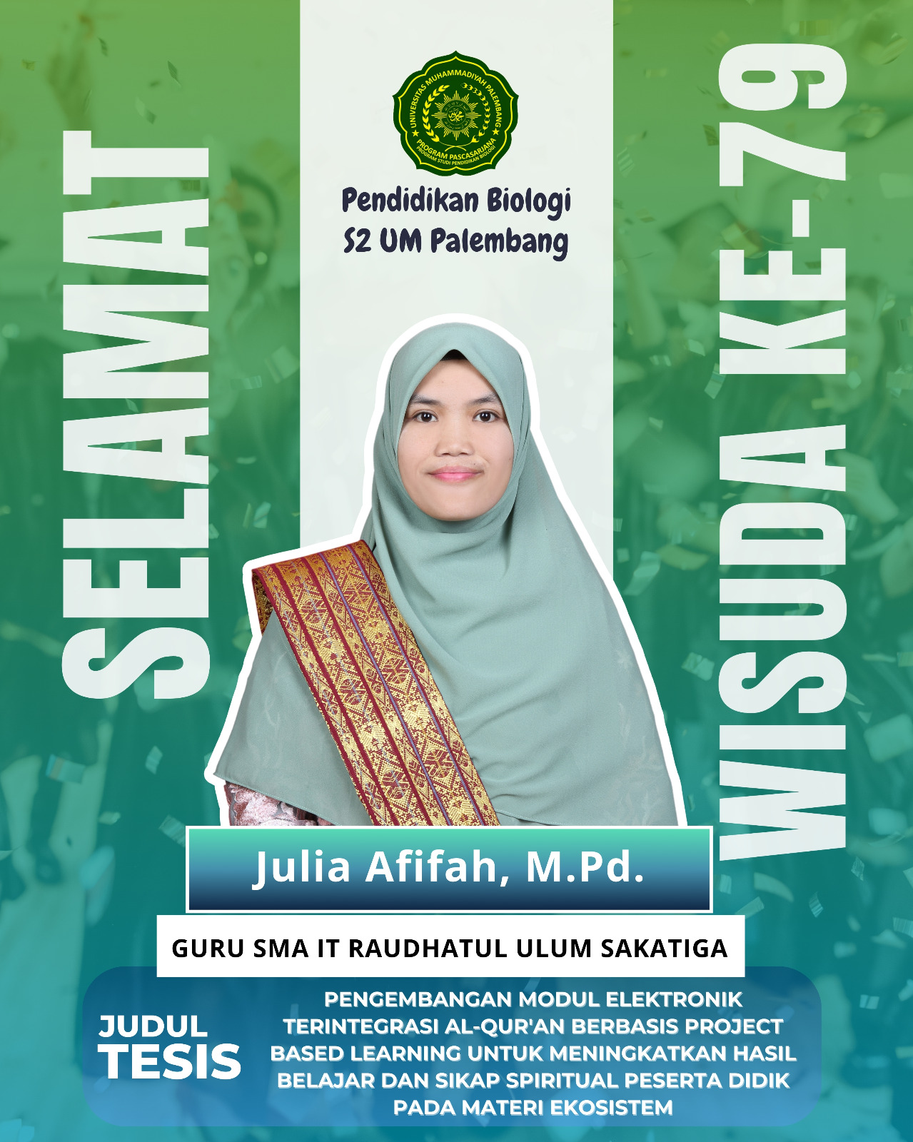 Julia Afifah merupakan wisudawan yang dikenal pantang menyerah dan memiliki motivasi yang tinggi untuk belajar. Hal ini terbukti dari IPK yang berhasil diraih sebesar 3.88. Saat ini beliau aktif menjadi guru di SMA IT Raudhatul Ulum Sakatiga. Belajar dari pengalaman menjadi guru, Julia berhasil mengembangkan produk modul elektronik terintegrasi Al-Qur’an berbasis PjBL untuk meningkatkan hasil belajar dan sikap spiritual peserta didik, pada materi ekosistem.