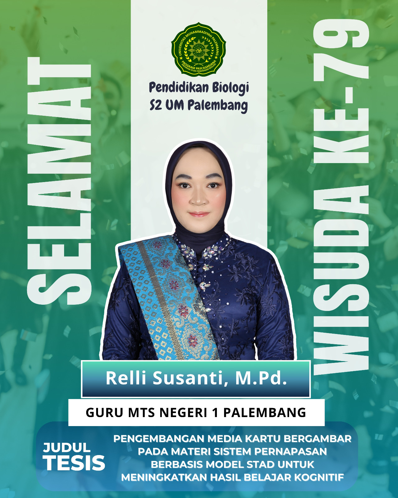 Relli Susanti merupakan wisudawan dengan IPK 3.62 yang memiliki semangat juang yang tinggi. Pengalaman menjadi guru di MTs Negeri 1 Palembang memberikan ide kreatif bagi Relli untuk mengembangkan media kartu bergambar pada materi sistem pernapasan berbasis model STAD untuk meningkatkan hasil belajar kognitif. Hal ini dilakukan sebagai bentuk solusi bagi permasalahan yang dialami murid, agar mencapai hasil belajar yang maksimal serta pembelajaran yang menyenangkan